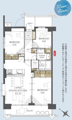 【居間・リビング】LDK12.3帖:カウンターキッチンの前にはダイニングテーブルを置き、奥にソファーやテレビを置く事で、ダイニング空間とリビング空間を分ける事ができメリハリがつきます!