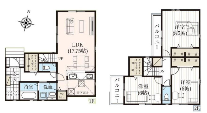 【居間・リビング】LDK17.75帖:ダイニングテーブルはもちろん、ソファーやテレビを置いても余裕があります!家族全員でくつろいだり、親族や友人を招いてホームパーティーをしても楽しそうですね!