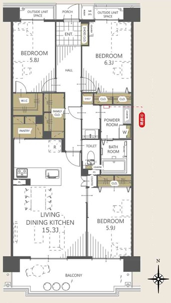 【居間・リビング】LDK15.3帖:キッチンまで明かりが届くペニンシュラキッチンを採用したLDKです。キッチンのリビング側には収納がございます!毎日家族が集まる場所ですので、ハンカチティッシュの収納に便利ですね。