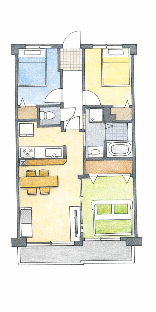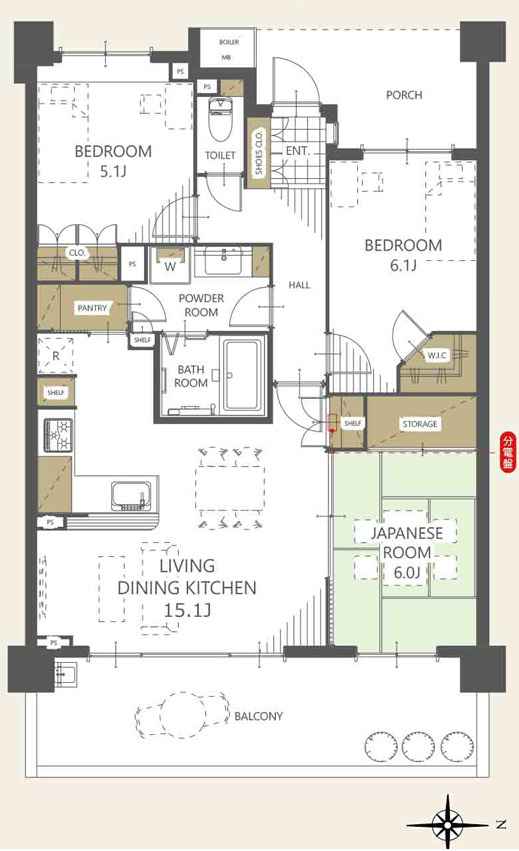 【居間・リビング】LDK15.1帖:ダイニングテーブルはもちろん、ソファーやテレビを置いても余裕があります!家族全員でくつろいだり、親族や友人を招いてホームパーティーをしても楽しそうですね!