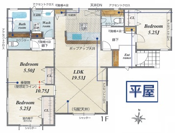 【居間・リビング】LDK19.5帖:カウンターキッチンの前にはダイニングテーブルを置き、奥にソファーやテレビを置く事で、ダイニング空間とリビング空間を分ける事ができメリハリがつきます!