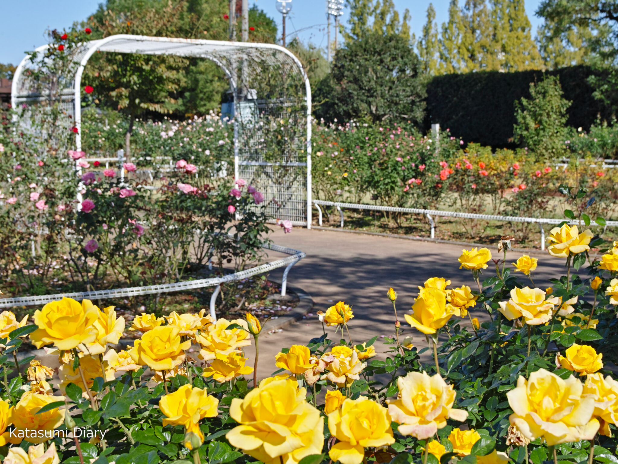 伊奈町制施行記念公園のバラ園は、春(5月上旬〜6月上旬)と秋(10月下旬〜11月中旬)に見頃。散歩しながら楽しめる動線やバラのアーチも整備されています。